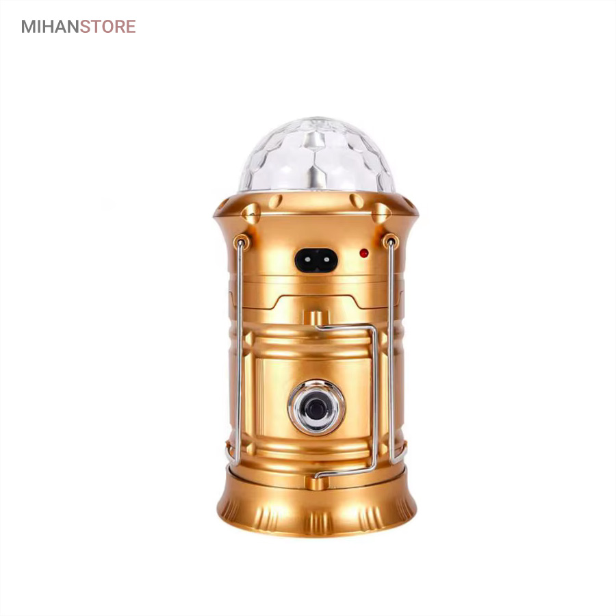 چراغ کمپینگ شارژی رقص نور دار قابل حمل به همراه رقص نور، محصولی با طراحی نوین و بسیار کاربردی است . این چراغ را میتوان تلفیقی از فانوس های قدیمی و چراغ قوه های جدید و رقص نور مدرن دانست .چراغ کمپینگ شارژی رقص نور دار، در واقع یک ابزار چند کاره است و میتواند به سادگی نیاز های شما در رابطه با نور را در مسافرت، پیک نیک و جشن های خانواگی و مواردی نظیر آن فراهم کند . شما میتوانید با کشیدن سر چراغ به سمت بالا (کشویی)، فانوس را روشن کنید و از آن برای تأمین نور محیط استفاده نمایید. چراغ اصلی فانوس دارای 6 چراغ ال ای دی است که در کنار هم نور قوه ای را ایجاد میکنید. همچنین در بالای این فانوس یک شیشه منشوری وجود دارد که هنگام روشن کردن با چرخش و نور پردازی فضای دل انگیزی را برای شما به وجود میآورد. این محصول خرید خوبی برای استفاده در کمپینگ و طبیعتگردی خواهد بود.ورودی برق روی دستگاه بوسیله سیم همراه به برق وصل شده و چراغ را شارژ مینماید تا بتوانید به صورت بی سیم از چراغ استفاده نمایید.خروجی یو اس بی روی دستگاه نیز برای شارژ تلفن همراه شما تعبیه شده است و برای شارژ کردن گوشی موبایلتان است.جنس بدنهی این محصول سبک و کم حجم، جنس بدنه از ABS + PC، محکم و بادوام است که بهسادگی آسیب نمیبیند و این امکان را به شما میدهد تا مدتزمان زیادی بهصورت مستمر از آن استفاده کنید. این محصول وزن قابلقبولی دارد و شما میتوانید بهراحتی آن را حمل کنید و در سفرها به همراه داشته باشید.